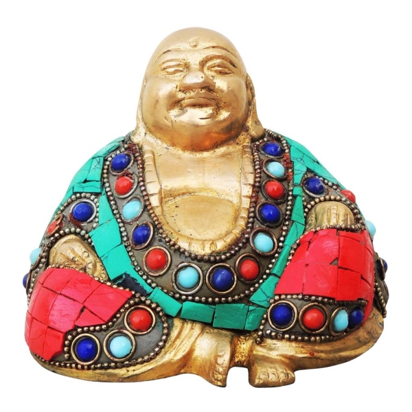 Brass Laughing Buddha Statue with Turquoise Coral Stone Finish