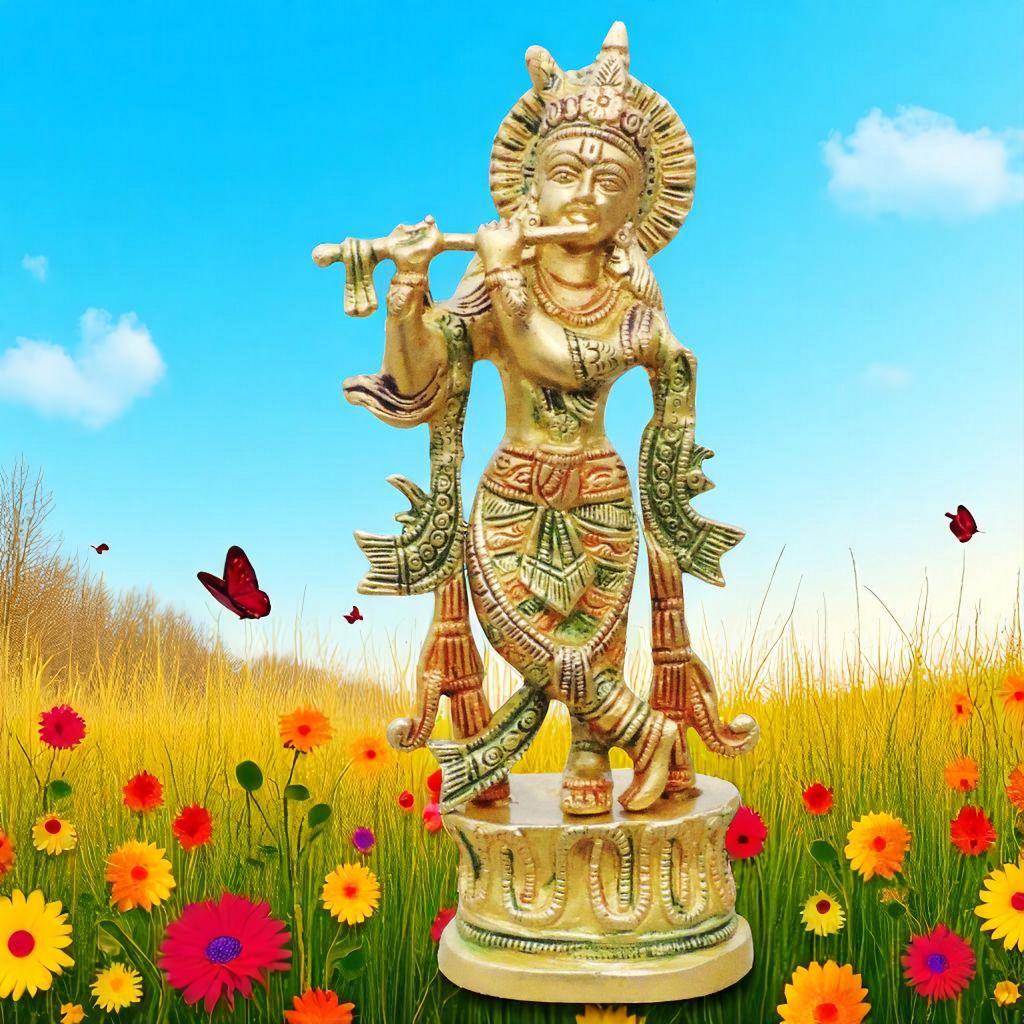 This statue is crafted from high-quality brass, a material known for its durability and timeless appeal. Brass not only offers a rich, warm tone but also ages gracefully, developing a unique patina over time. The intricate detailing of the statue showcases the skill of the artisans who created it, highlighting the delicate features of Lord Krishna. The vibrant colors used in the statue further enhance its visual appeal, making it a striking focal point in any setting.