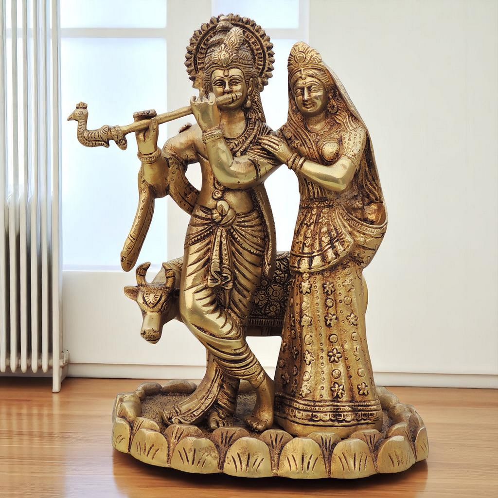 Brass Showpiece Radha Krishna Pair with Cow God Idol Statue